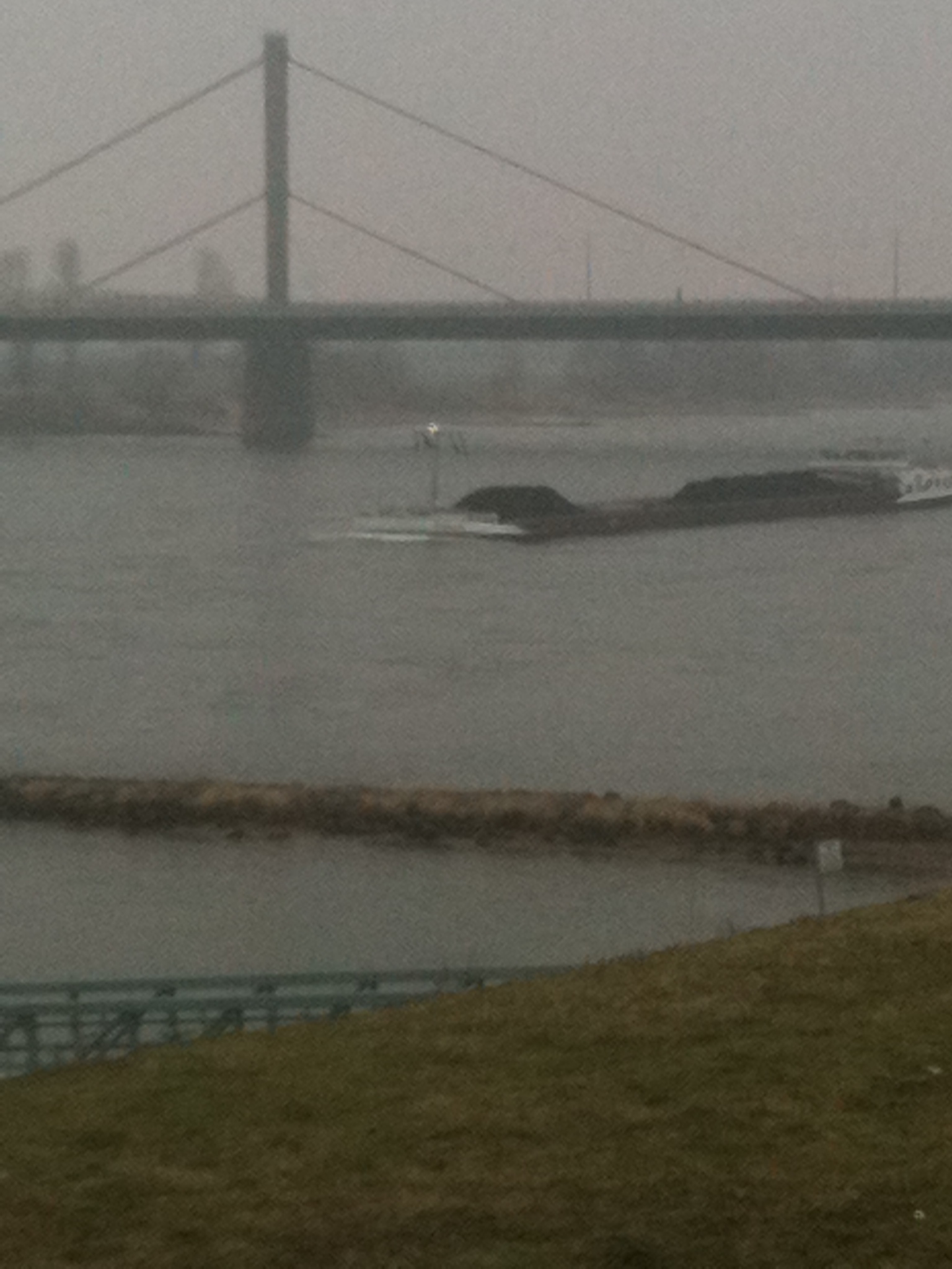 Leverkusen am Rhein, 9 Grad Celcius, kalter Regen, das Haar sitzt. Große Pötte im Nieselregen bestaunen, graue Steine am Ufer sammeln, vollbärtige Angler in Ruhe lassen, große verfilzte schwarze Hunde streicheln, die rostige Schwimmerin am Rhein bewundern.