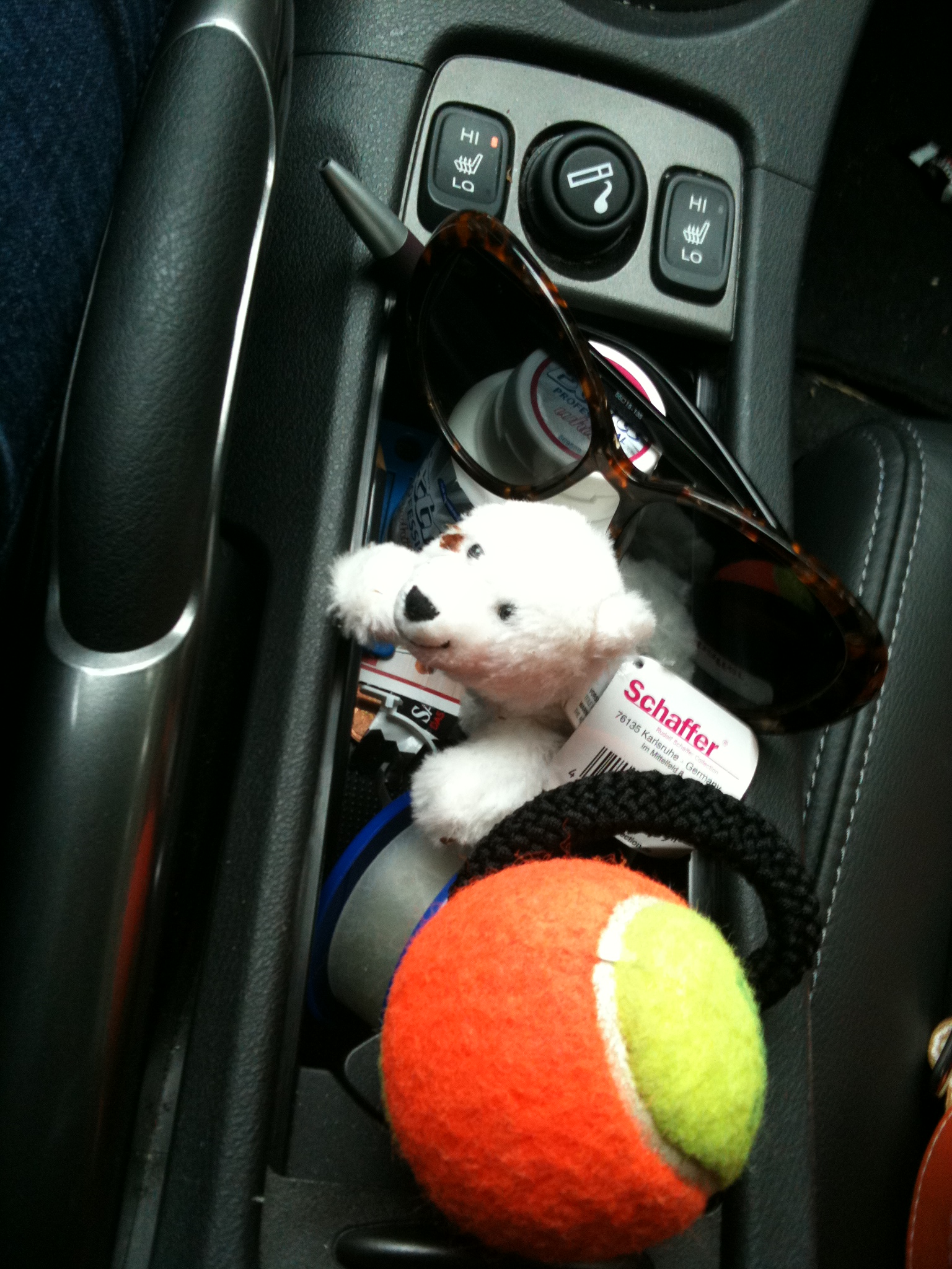 Da man ja bei so einem Stau auf der A3 vielvielviel Zeit hat, sich umzugucken, habe ich mal ein bißchen aufgeräumt und geguckt, was so in meinem heißgeliebtem Honda rumliegt.
